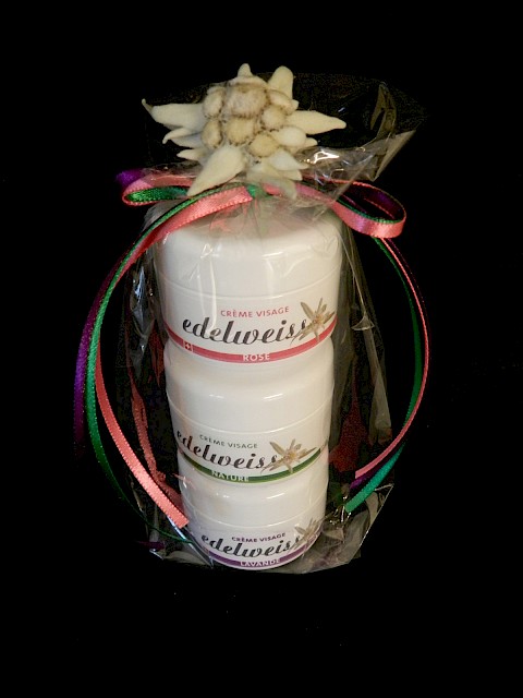 Sind Sie auf der Suche nach einem besonderen Geschenk? Bestellen Sie unsere 3 Gesichtscremen (15ml nature, 15ml mit Rosenduft, 15ml mit Lavendelduft), hübsch verpackt und dekoriert mit einer Edelweissblüte